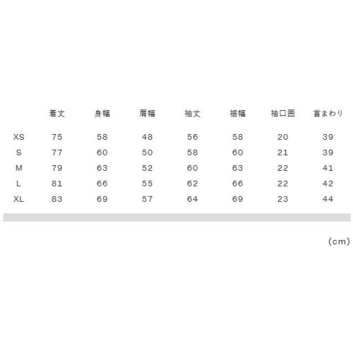 XS:着丈75、身幅58、肩幅48、袖丈56、裾幅58、袖口囲20、首まわり39 S:着丈77、身幅60、肩幅50、袖丈58、裾幅60、袖口囲21、首まわり39 M:着丈79、身幅63、肩幅52、袖丈60、裾幅63、袖口囲22、首まわり41 L:着丈81、身幅66、肩幅55、袖丈62、裾幅66、袖口囲22、首まわり42 XL:着丈83、身幅69、肩幅57、袖丈64、裾幅69、袖口囲23、首まわり44 |