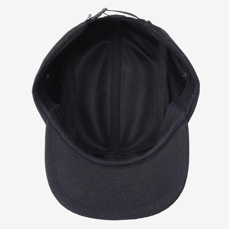 機能的なポリエステル素材を使用しながら、ナチュラルな風合いを引き出した、麦わら調の5パネルキャップ。