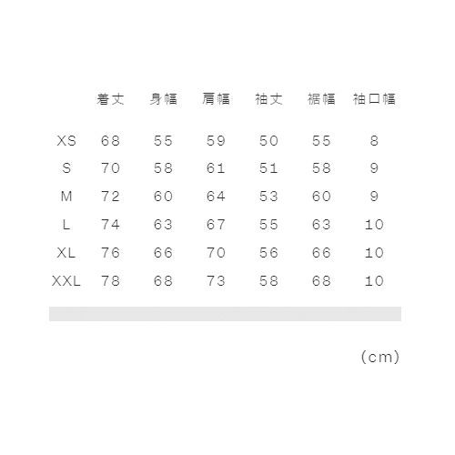 XL:着丈76、身幅66、肩幅70、袖丈56、裾幅66、袖口幅10
