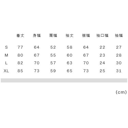 XL:着丈85、身幅73、肩幅59、袖丈65、裾幅73、袖口幅25、袖幅31