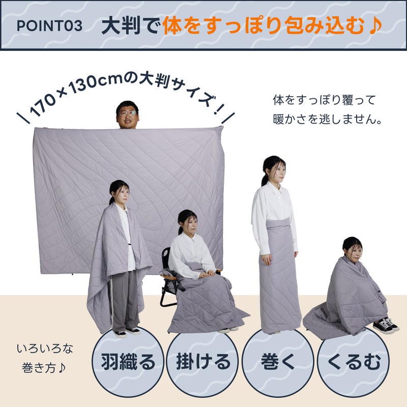 アウトドアから旅行まで一年中使える中綿入り多機能ブランケット。
