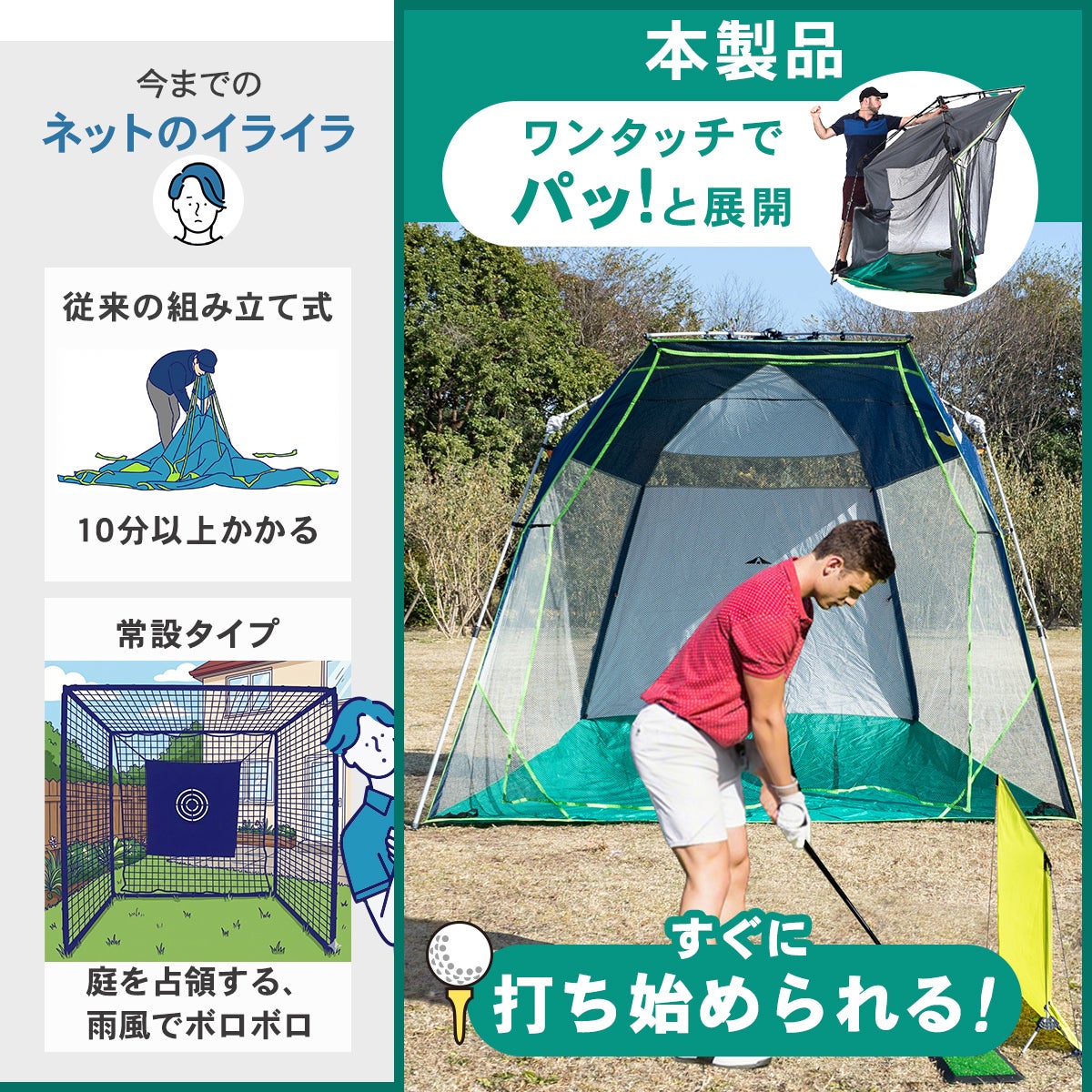 他の画像を見る 即納 NEW 再入荷 LINE限定10%OFFクーポン 4/1-3 リーディングエッジ(LEADING EDGE) QUICK-UP GOLF RANGE QUICK-UP GOlf RANGE ゴルフ 練習ネット ネイビー×グリーン LES-GTS 販売価格 ¥ 19,800 税込 %OFF ワンタッチでパット開く常設不要な新ゴルフネット! 詳細を見る お気に入り登録